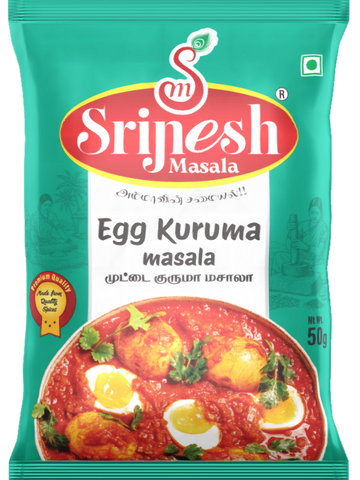 Boil 5 eggs, remove shell and make them into 10 pieces. Fry Mustard in cooking oil with 100g Chopped Onions, 2 green chilli, 3 tomatoes and Curry leaf, 1 tablespoon of ginger garlic paste. Add 50g Srinesh Egg Kuruma, 1 cup coconut paste, necessary salt and water, Add egg pieces and boil contents for 10 minutes, Now tasty Egg Kuruma is ready. Mushroom, Cauliflower, Potato Kuruma also can be prepared using this masala.